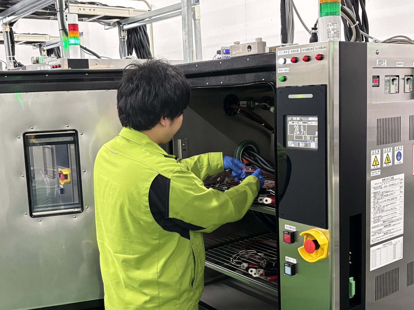 【充放電試験装置スペック】 チャンネル数:合計120ch 槽内温度範囲:-40~100℃ 試験槽数:9個 |