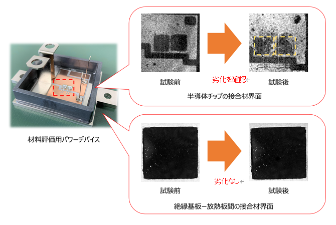 超音波映像法は、主にパワーデバイスや部品の実装されたプリント配線板などの、接合材の状態確認に利用されます。下図は弊社で設計・製作した、材料評価用パワーデバイス です。パワーデバイスの品質で重要となるのは、チップ下等の各接合界面状態です。各種信頼性試験により、接合材は熱応力によって劣化しやすいものがあります。下図に、パワーサイクル試験前後におけるパワー半導体チップ直下および絶縁基板―放熱板間の接合材を、超音波映像法で透視した事例を示します。試験による半導体チップ接合材の劣化に伴うクラックや剥離が検出できていることが判ります。接合材は、はんだのみならずAgやCuの焼結材(シンタリング材)でも観察が可能です。
