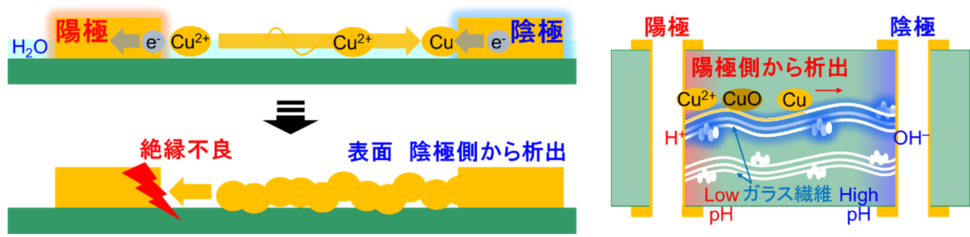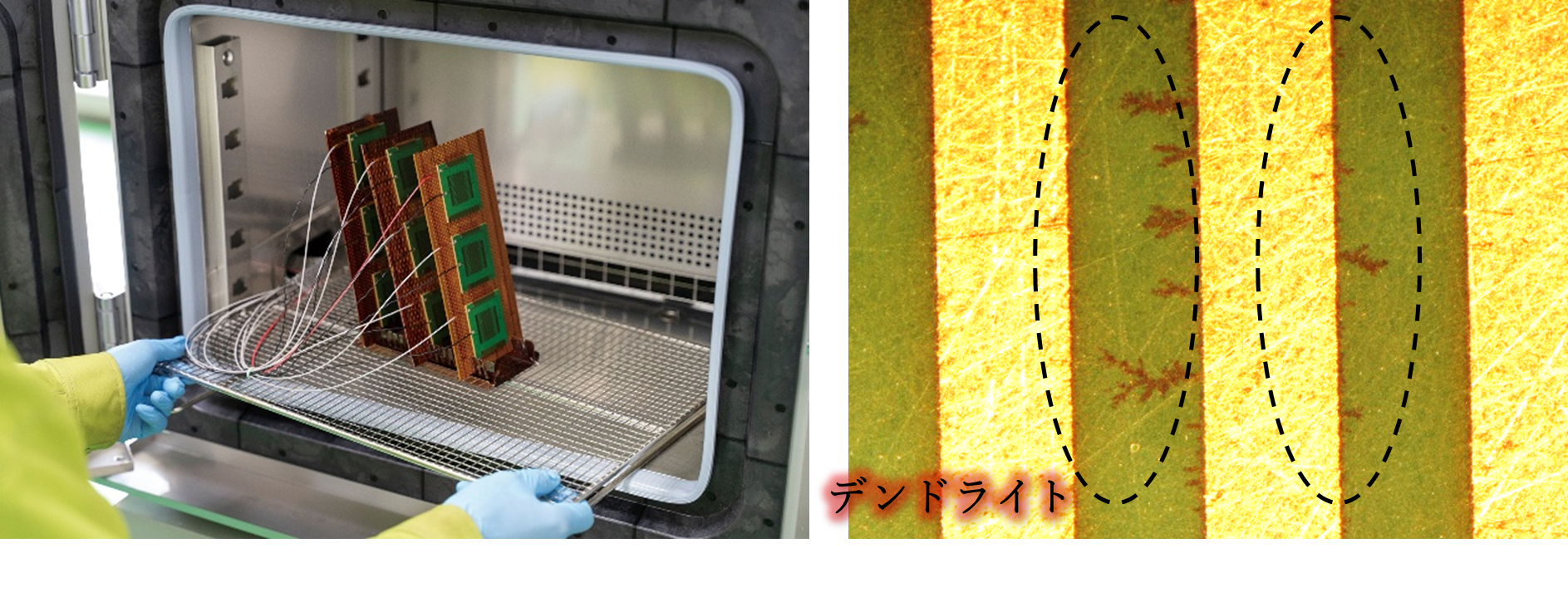 マイグレーション試験は、高温高湿環境下で連続的な電圧印加を行い、絶縁材料の劣化やそれに伴うイオンマイグレーション現象の発生を確認することで、絶縁信頼性の評価を行います。耐CAF性試験は、基板内のガラス繊維などに沿って発生するCAF(Conductive Anodic Filaments)と 呼ばれる現象の発生確認を行います。特に多層基板のスルーホール間でみられる現象で、基板の多層化、複雑化、配線の高密度化などに伴い、近年では耐CAF性試験の要求も増えています。