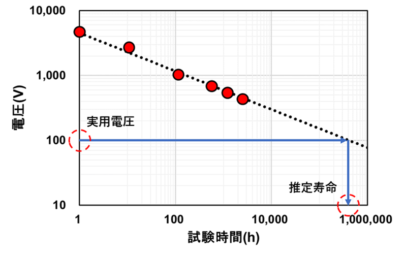 作成したサンプルに試験電圧を印加し、印加電圧(Voltage)に対し、絶縁破壊が生じる時間(Time)をプロットします。プロットから適切な近似線(V-t特性線)を作成することで、製品の実用電圧における寿命を推定することが可能です。下記結果を例とすると、100Vでは約400,000時間の寿命があると予測できます。